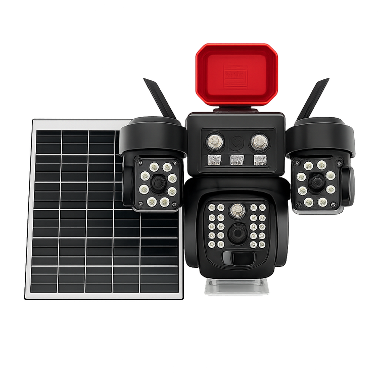 دوربین هوشمند V380 PRO مدل LX-XW818 دارای سه لنز واقعی و سه تصویر با کیفیت , طراحی مناسب برای فضاهای بزرگ مثل کارخانجات و فضاهای صنعتی , دارای پنل خورشیدی بدون نیاز به برق و کابل کشی مناسب برای مکان هایی که به برق دسترسی ندارند. دسترسی به اینترنت از طریق سیم کارت.